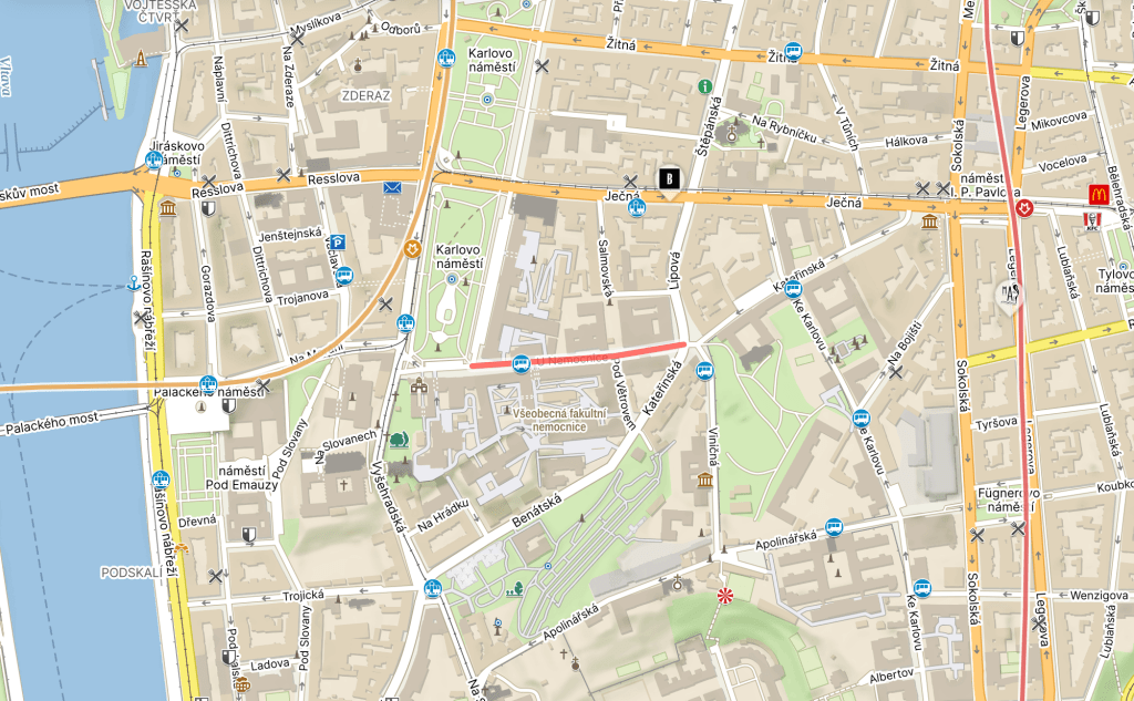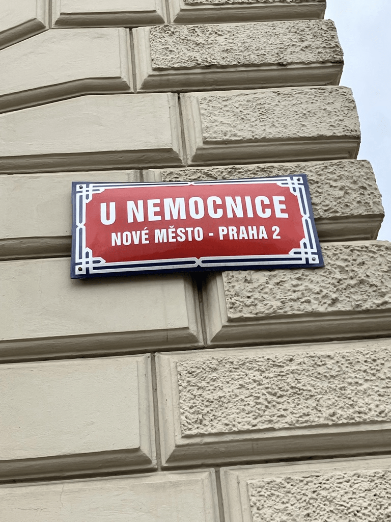 U Nemocnice (‘By the Hospital’) has been the street’s name since 1869. The hospital in question is Všeobecná fakultní nemocnice v Praze (General University Hospital in Prague / VFN).