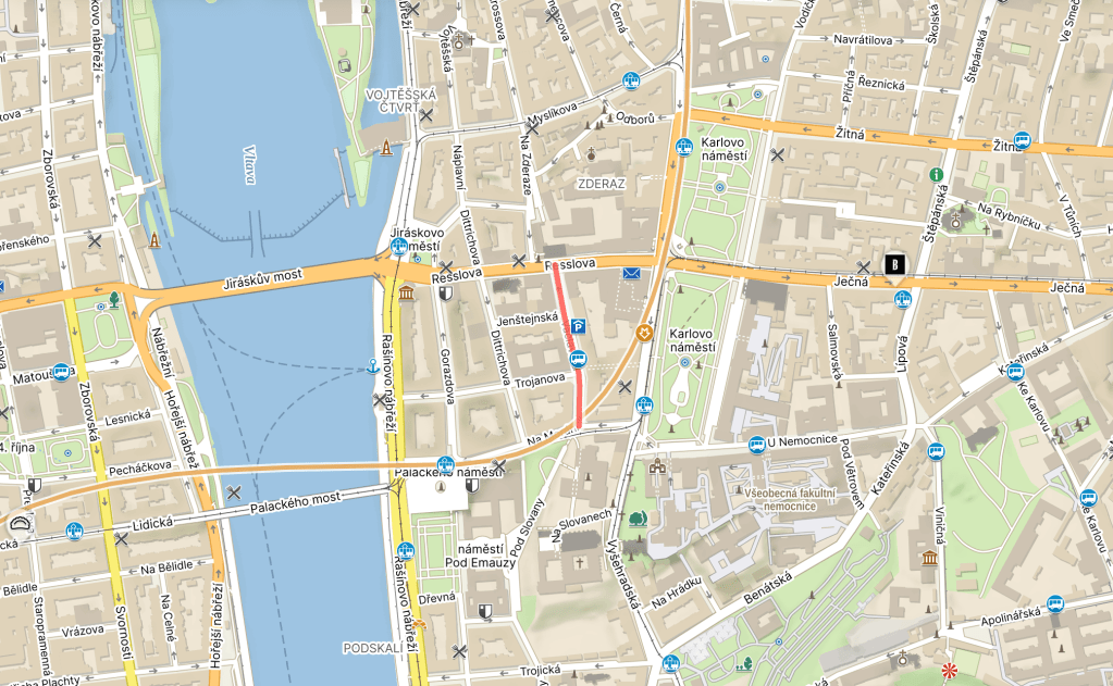 Until 1839, the street had various names. One of these was Na Lávkách (on the footbridges), so called because there was a footbridge leading from the Old Town to Podskalí along here.