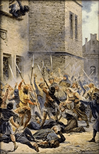 A stone was allegedly thrown from the Town Hall, hitting one of the protestors. The crowd stormed the building, throwing the judge, the mayor and five others out of the window to their deaths. This was the First Defenestration of Prague.