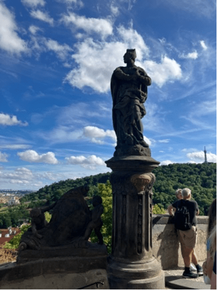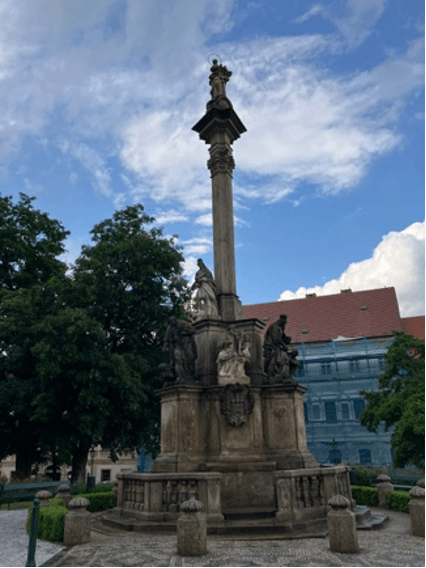 The Mariánský morový sloup / Marian Plague Column, including Saints Vitus, Wenceslas and Adalbert, completed in 1736, commemorates where religious services were held during the Great Plague of 1713/4.