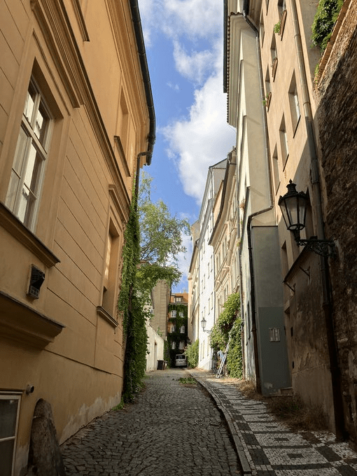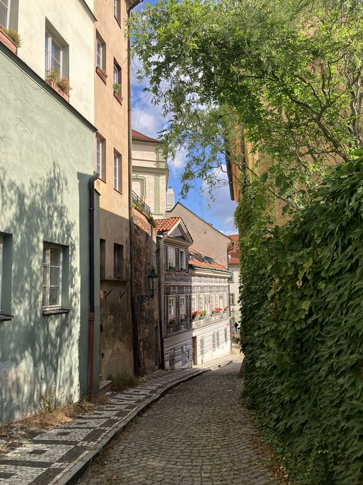 Jánská contains the back ends of buildings whose façades we’ll get to when we reach Nerudova. Even without the house fronts (or perhaps because they’re elsewhere), views are quite beautiful.