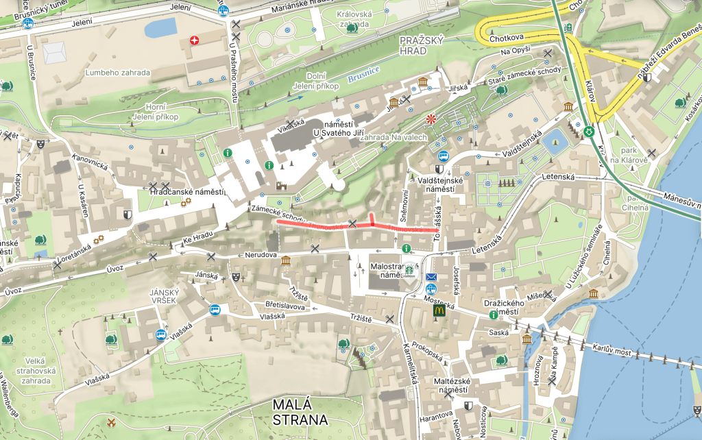 From the 18th century, the lower part of the street was called Sklenářská (Glassmakers’ Street), the middle part was called Farní (Parish), and the upper part was called Thunovská. They’ve all been one street since 1870.