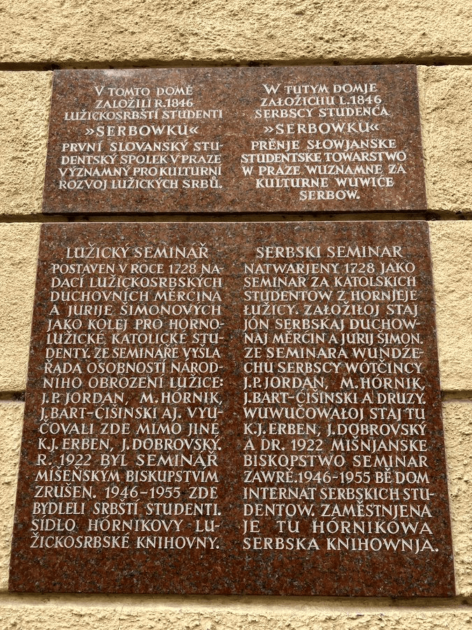 This plaque on the front of the building is a great opportunity to compare and contrast the Czech and Sorbian languages:
