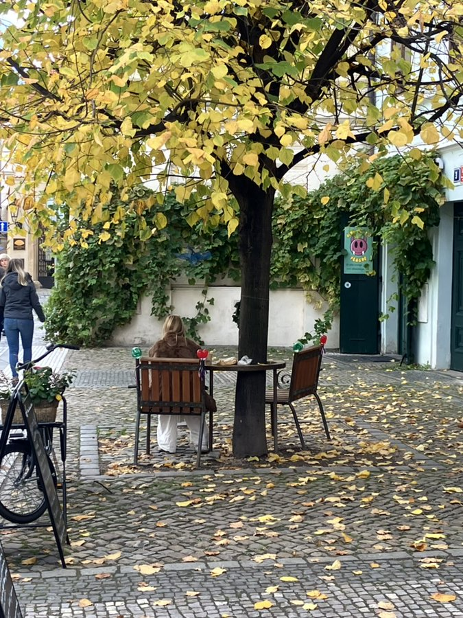 These are part of a series of memorials to Václav Havel, all of which have the same style (round table, two chairs, usually a tree in the middle). The project is called Václav Havel’s Place; the idea came from Havel’s long-time friend, Bořek Šípek.