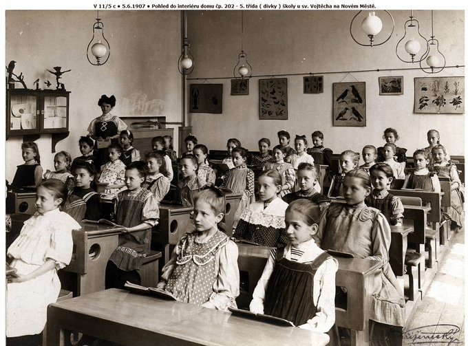 Named after a textbook by Comenius, the school was opened in 1906, originally as a girls’ school. Its list of former students is basically a who’s who of the Czech entertainment industry. Great pics from 1907 here.