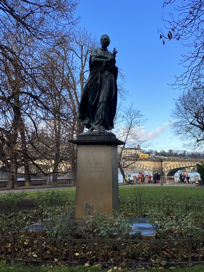 The island also features a 1955 sculpture, by Karel Pokorný, of Božena Němcová (https://whatsinapraguestreetname.com/2024/08/25/prague-2-day-110-bozeny-nemcove/) – the location quite apt, as the palace was where she first met fellow poet Václav Bolemír Nebeský, whom she would fall in love with.