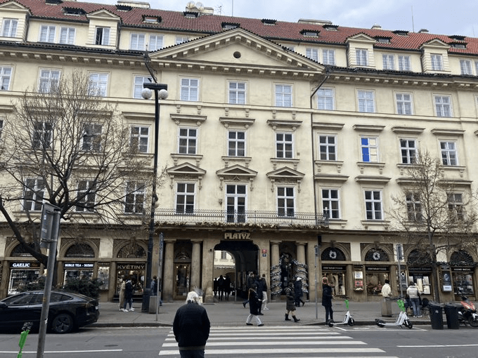 At number 37, Palác Platýz has a much longer history than most buildings here – back to 1347, though obviously not in its current form. Nice courtyard.