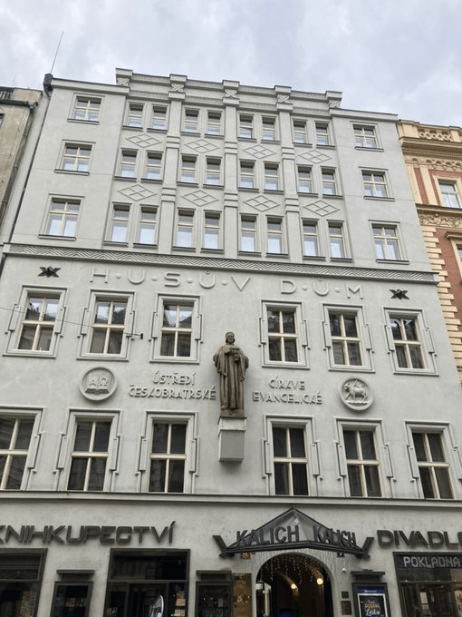 Husův dům / The Hus House (number 9) has existed since the Middle Ages, but was given a cubist makeover in the 1920s. It hosts the Synod Council of the Evangelical Church of the Czech Brethren.