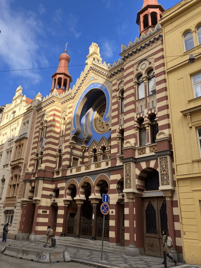 Josefov, formerly Prague’s Jewish ghetto, bore the brunt of this. Three important synagogues were destroyed, and so, in 1899, the Israelite Synagogue Association bought some land on this street in order to build a new one.