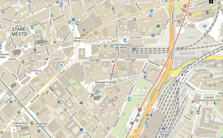 While the other side of the street includes Správa železnic (the Railway Administration), Czechia’s sixth-biggest employer, and one of its most distinctive logos, at numbers 5 and 7.