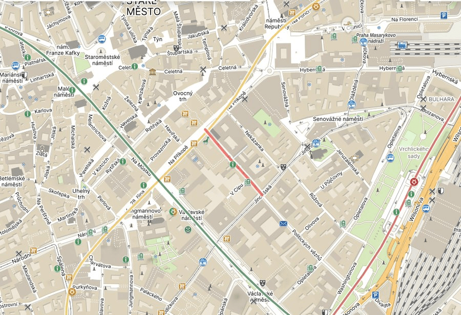 On the corner with Na Příkopě, there was once land and gardens belonging to – great word alert – a maltman called Kříž or Křížalova, which led to the street being renamed Křížalova in 1680.