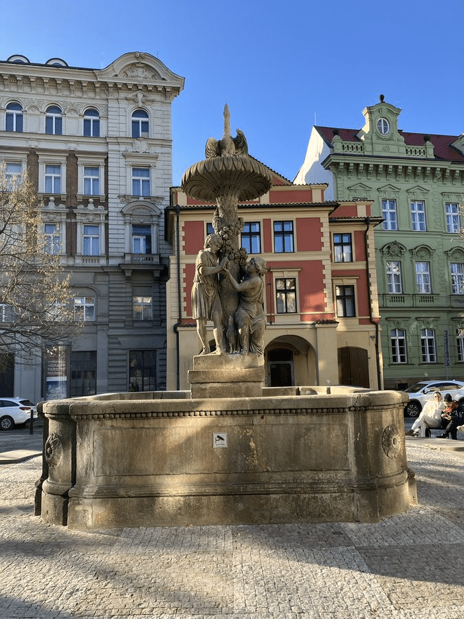 The house behind the fountain is the only ancient building on the square that still exists; it’s called U tří stupňů (The Three Degrees) and used to be a cafe, mainly frequented by those who worked at the market.