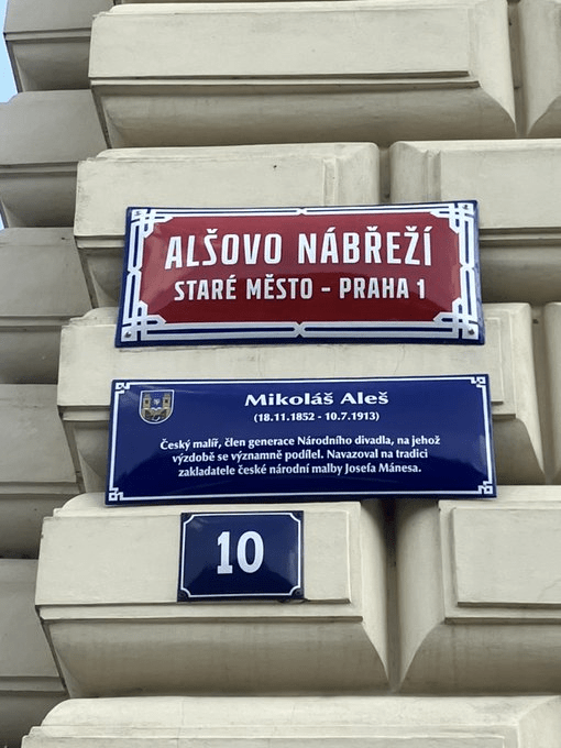From 1885, Aleš ran a painting academy where this embankment is now named after him; the street sign at the top of the post is on the building’s façade, which we’ll take a closer look at tomorrow.