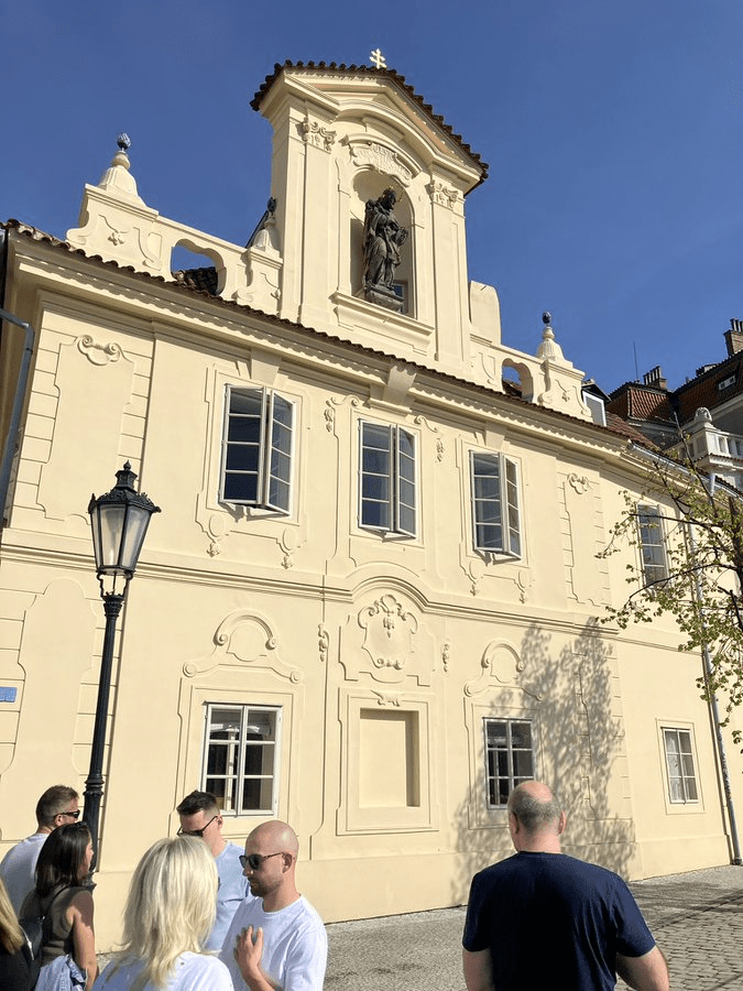 More specifically, ‘around here’ means ‘number 2 Alšovo nabřezí’ (https://whatsinapraguestreetname.com/2024/10/22/prague-1-day-210-alsovo-nabrezi-ales-embankment/), which, nowadays, is called Prádlo or Na Prádle, was built in the first half of the 18th century, and looks like this.