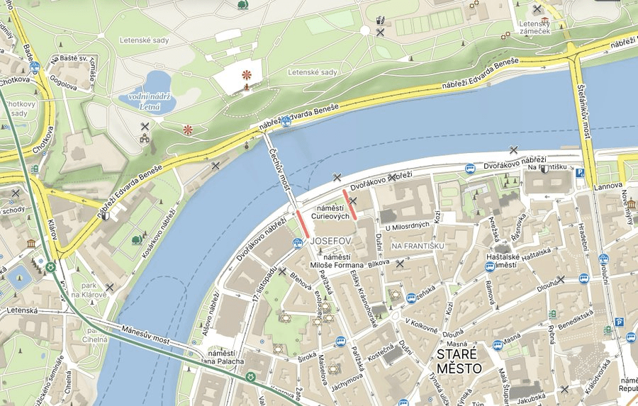 Náměstí Curieových was given its current name in 1960. Before that, it was called Janské náměstí, apparently because John of Nepomuk’s body was fished out of the Vltava here in 1393.