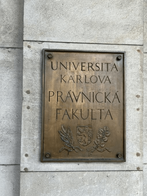 The square includes the entrance to the Law Faculty of Charles University; the faculty was founded in 1348, but the building was created between 1924 and 1931.