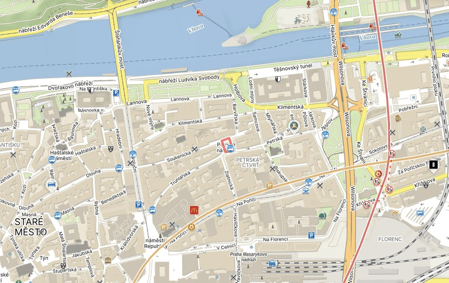 Until the early 20th century, Petrská čtvrť’s economy was dominated by its proximity to the Vltava; mills survived until 1915-7, when the banks of the Vltava were regularised.