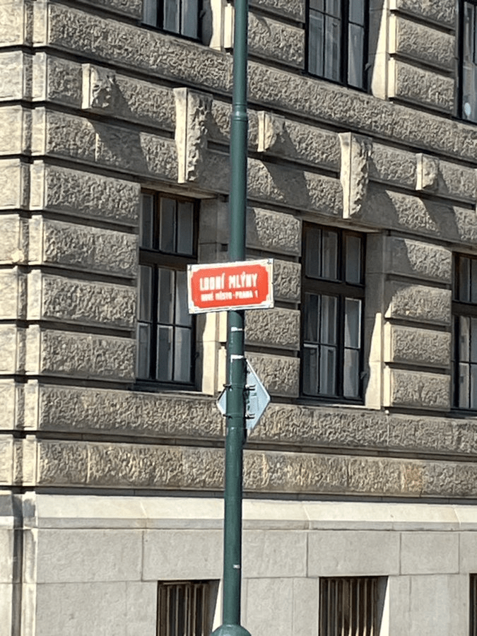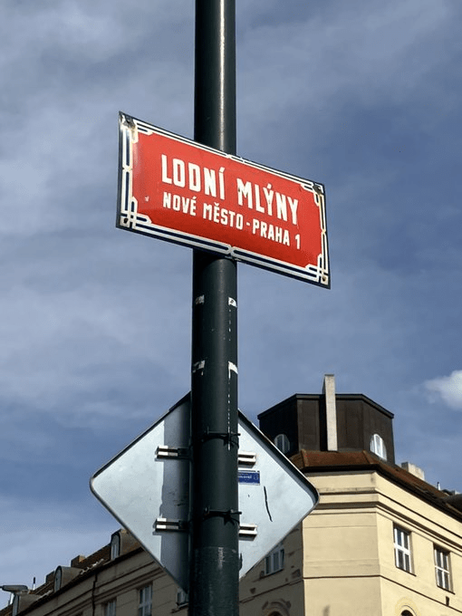 That translates as ‘ship mills’, as does the name the street had in the 14th century (Lodecké mlyny). The ship mills have already been covered here, just a few metres away: https://whatsinapraguestreetname.com/2024/11/10/prague-1-day-263-lodecka/.