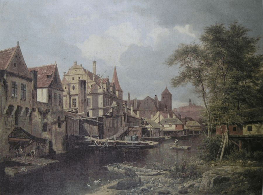 Their name is first mentioned in connection with the mills in 1398; here are the mills in 1853, as painted by Bedřich Havránek.