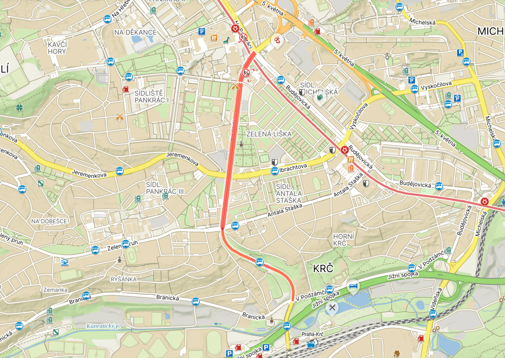 Part of Na strži is currently inaccessible, all in the name of the famous Line D of the Prague Metro: https://www.praha4.cz/Vystavba-metra-D-uzavre-na-nekolik-let-cast-ulice-Na-Strzi.html.