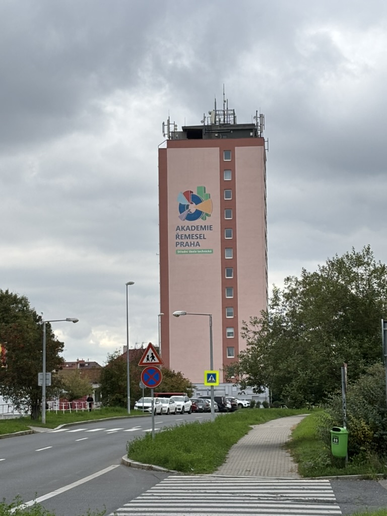 The street’s most famous building (certainly the most dominant) is surely the Academy of Crafts / Akademie řemesel Praha, a technical secondary school – so much so that its online presence is at https://www.zelenypruh.cz.