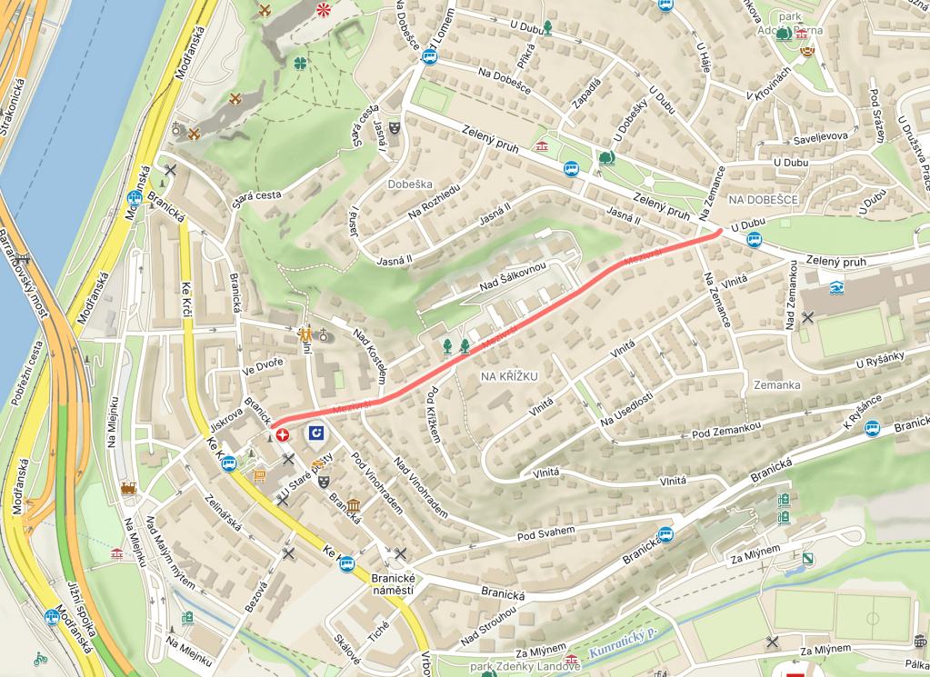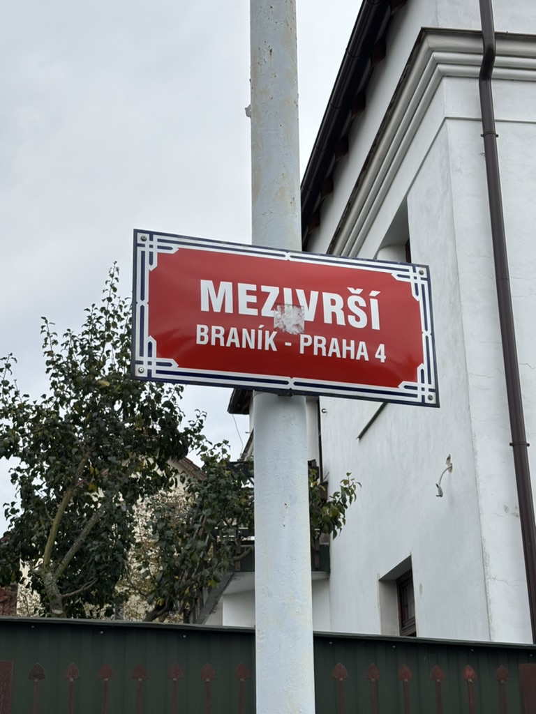 The street has three above-average-sized oak trees, saved from being cut down by local residents in 2007 and declared as ‘commemorative trees’ (think listed buildings, only with trees) in 2008: https://www.prazskestromy.cz/stromy/pamatne-stromy/87-skupina-dubu-letnich-v-ulici-mezivrsi/.