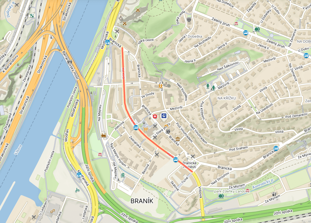 Ke Krči leads (to an extent) towards Krč, a district with about 27,300 inhabitants (about twice as many as either Braník or Podolí).