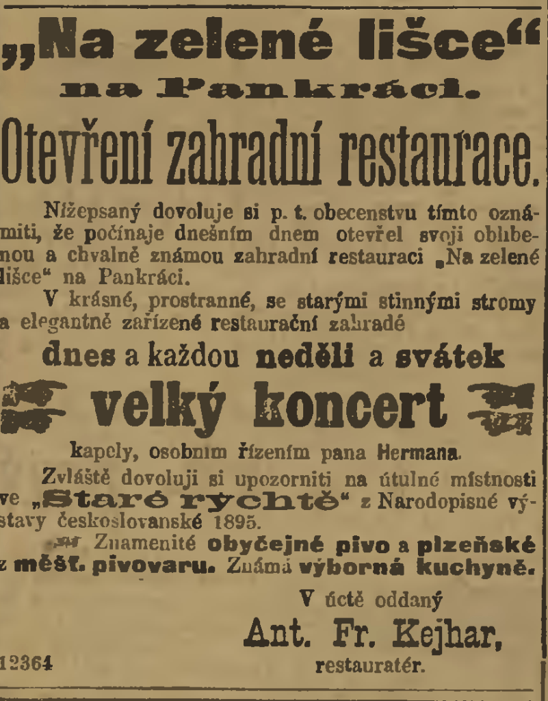 Some time before 1720, an inn was built, south of Pankrác (then a village) and near the road that led from Prague to České Budějovice. It had a green fox – a zelená liška – painted on its gable.