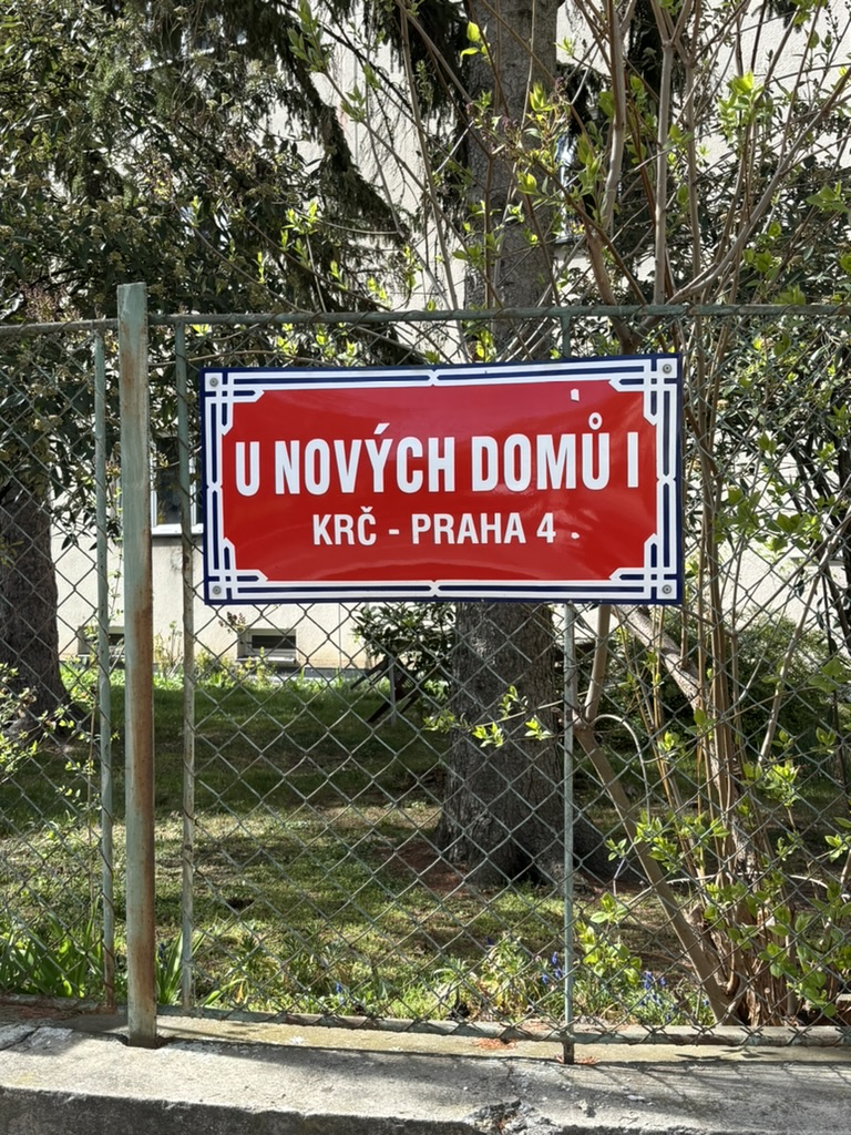 ‘Nové domy’ are ‘new buildings’ or ‘new houses’. In 1935, the houses around here were indeed new – they had been built by the Ústřední sociální pojišťovna / Central Social Insurance Agency.